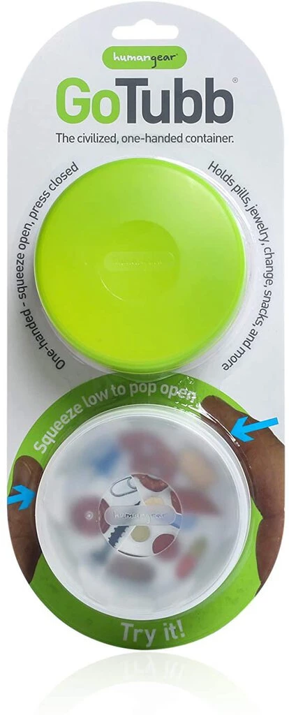 Patented worldwide, the GoTubb features an ingenious design that allows you to open and close it with one hand only. Just squeeze the sides and the lid is released. To close, simply press back on. The GoTubb works great with pills, knick-knacks, snacks, vitamins, change, bits-n-pieces, you name it. A recessed, textured labeling area resists being rubbed off. The transparent tops let you see what’s inside without opening them.
