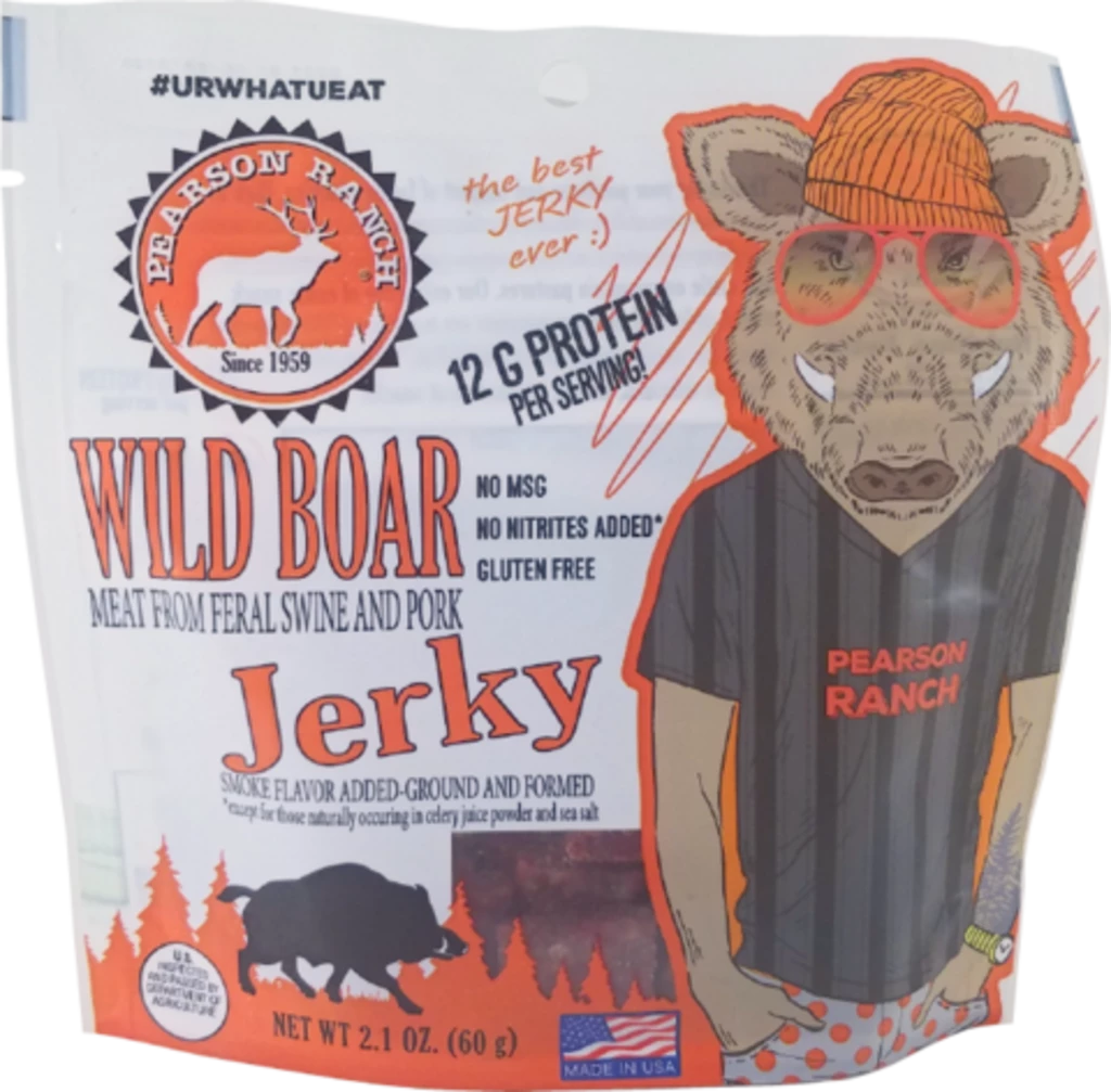 2.1 ounces. Low-fat. 12 grams of protein per serving. All-natural. Perfectly seasoned. Bite-sized bits of wild boar. You’ll go hog wild for it. Pearson Ranch Jerky’s wild boar jerky bags are the perfect snack for any time of day (or night). And just in case you can’t finish off the bag in one sitting, we’ve made it resealable. Like all of Pearson Ranch Jerky, it’s also MSG-free, gluten-free, and contains no added nitrites.